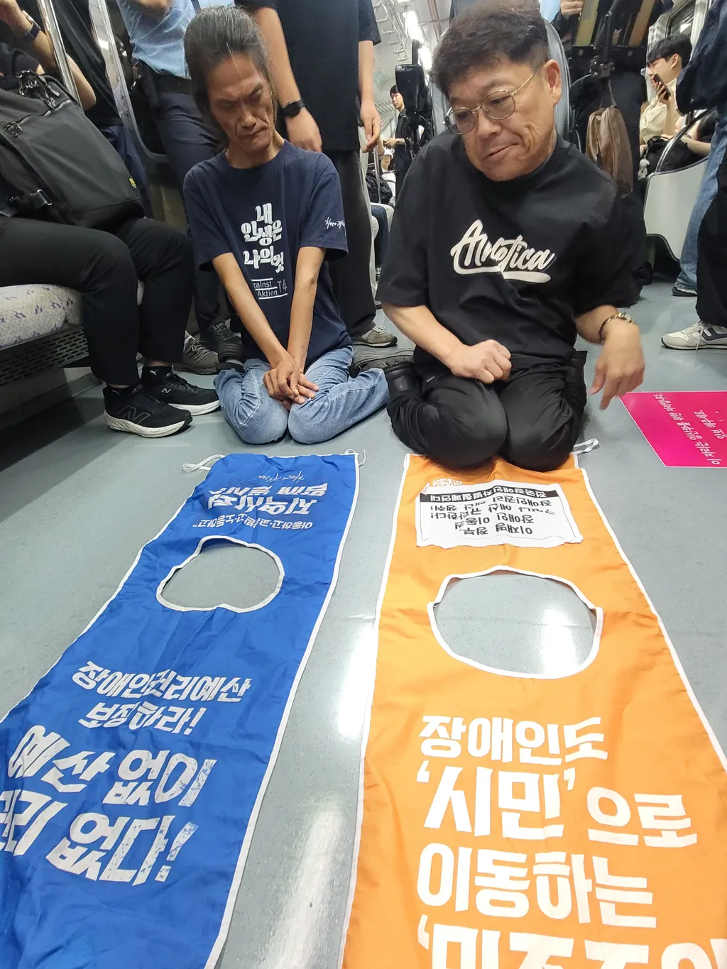 8. 이제 2026년 예산안은 국회의 시간이 되었습니다. 기획재정부가 국회로 넘긴 장애인이동권 구멍난 예산, 차별을 조장하고 비장애인중심의 운영을 강화하는 장애인자립생활센터 갈라치기 예산, 장애등급제 가짜 폐지를 세습하는 가짜예산, 탈시설권리 무시 집단적 수용시설 강화하는 감금예산, 오세훈표 권리중심공공일자리 무시 예산을 넘어 광장에서 빛의 혁명으로 집권한 국민주권정부 이재명 정부에서 거대여당이 된 22대 국회가 “장애인도 시민으로 이동하는 민주주의” 실현을 위한 진짜 장애인권리예산를 보장할 때까지 간절한 마음을 담아 출근길 지하철에서 포체투지를 진행합니다.