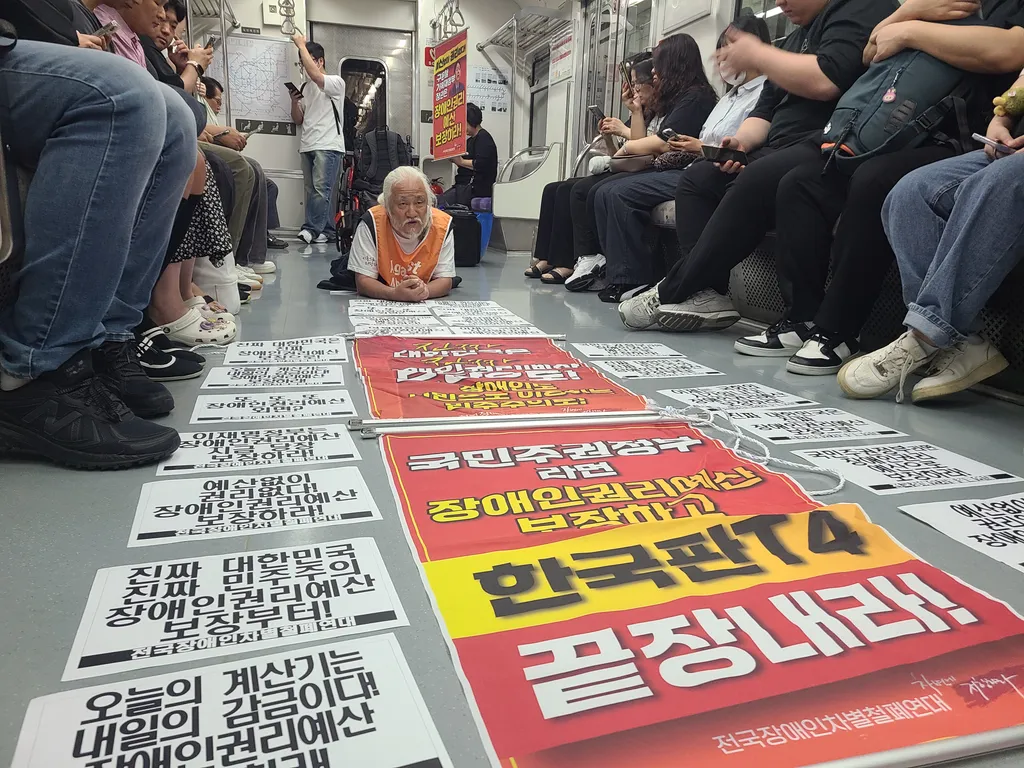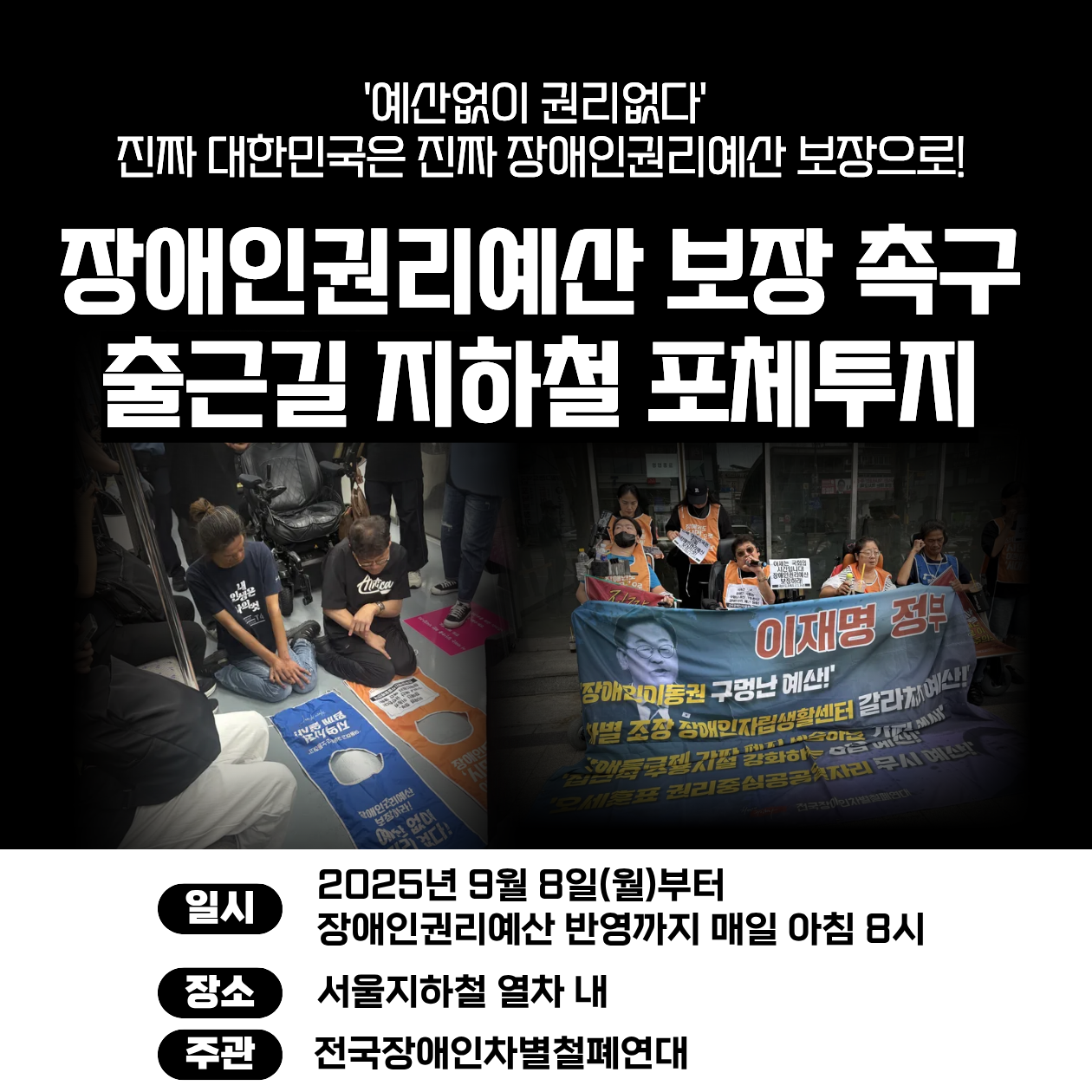 11. 이재명 정부가 이야기하는 ‘진짜 대한민국은 진짜 장애인권리예산 보장으로!’ 이루어져야 합니다. 이에 전장연은 9월 8일부터 장애인권리예산이 반영되는 날까지 매일 아침 8시에 “'예산없이 권리없다' 진짜 대한민국은 진짜 장애인권리예산 보장으로! 장애인권리예산 보장 촉구 출근길 지하철 포체투지”를 진행합니다. 정치는 더 이상 헌법에 명시된 권리를, 본연의 책임을 외면하지 마십시오.