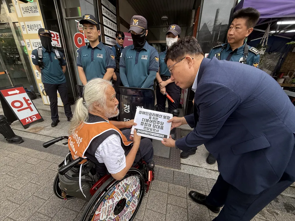10. 당선 이후 지난 8월 3일 정청래 당 대표와의 면담을 요청하는 공문을 발송하였고, 지난 9월 5일 출근길지하철탑니다 이후 국민의힘, 더불어민주당, 조국혁신당에 찾아가 당대표 면담을 요청하였습니다. 그러나 지금까지 묵묵부답입니다. 이에 오늘 다시 정청래 당대표의 사무실에 찾아가 장애인권리예산 보장에 대한 간절함을 담아 당 대표 면담을 촉구하는 기자회견을 진행하였습니다.