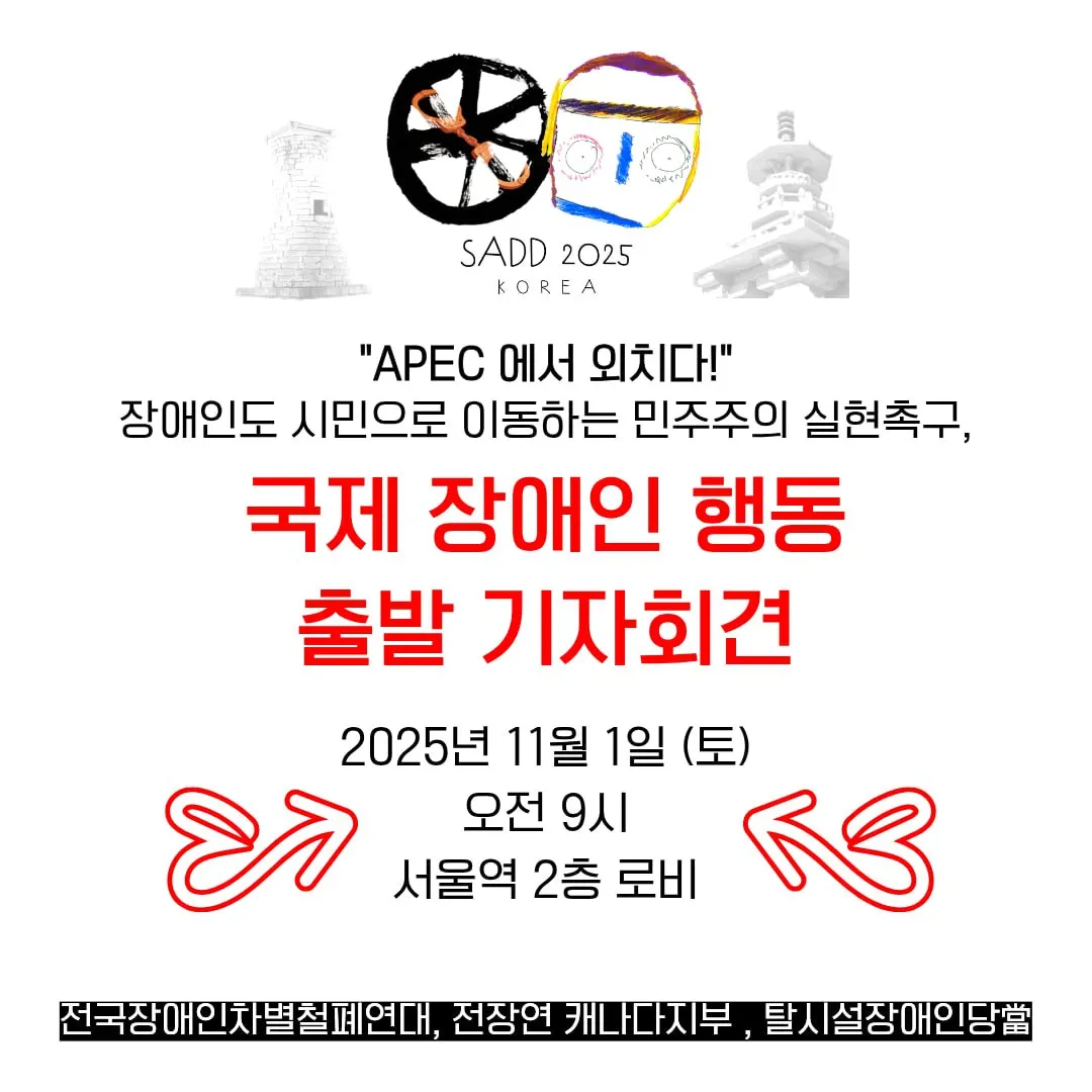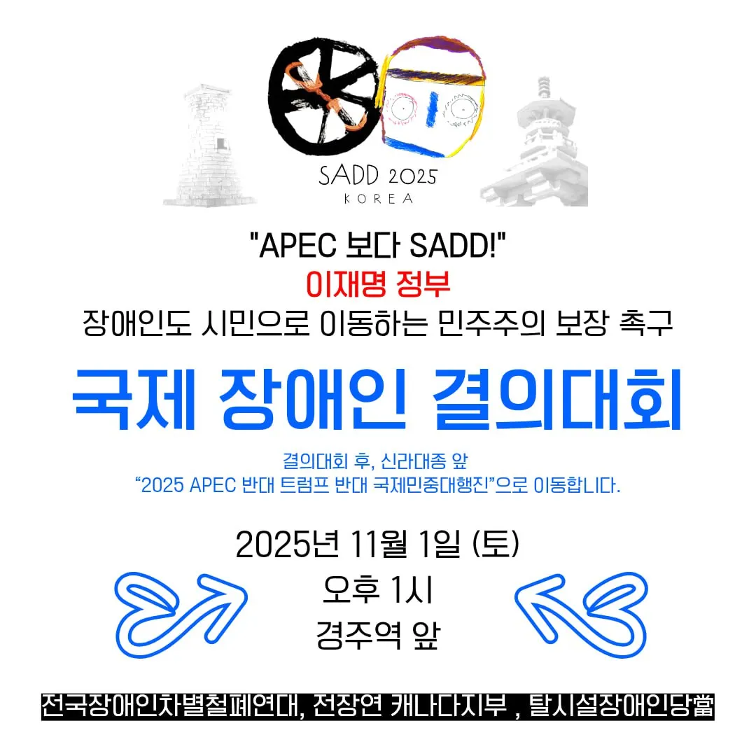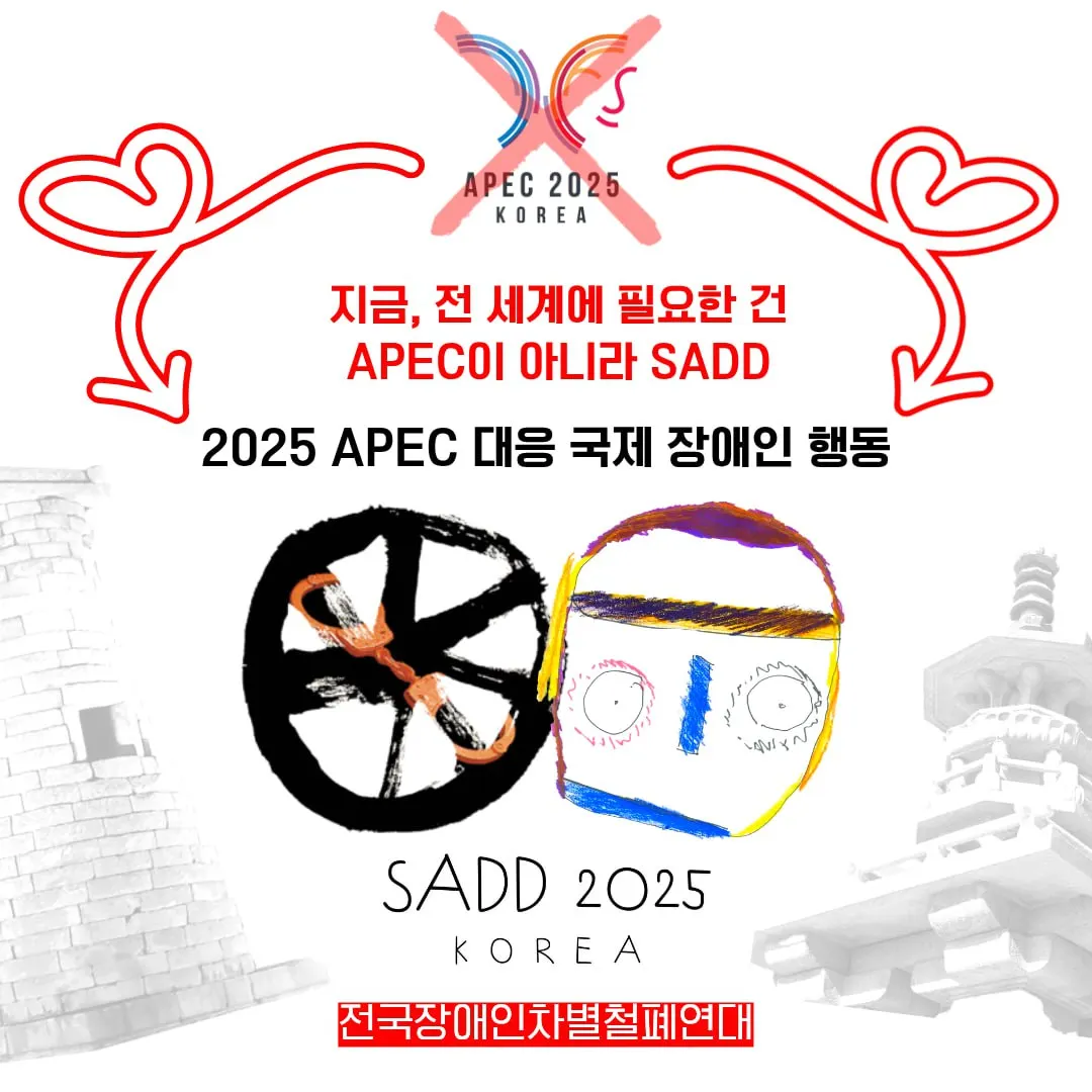 8. 지금 세계에 더 필요한 것은 APEC이 아니라 SADD(Solidarity Against Disability Discrimination)이다. 차별과 비장애중심주의(Ableism)에 맞서 연대해야 하며, 우리가 함께 만들어야 할 미래는 “SADD – Self-determination, Accessibility, Decent work, Deinstitutionalization”, 즉 자기결정권, 이동권, 괜찮은 일자리, 탈시설의 네 가지 원칙 위에 서야 한다. 장애인도 이동하고, 교육받고, 노동하며, 감옥 같은 시설이 아닌 지역사회에서 함께 살아가기 위한 장애인권리예산을 이제는 이재명 정부가 책임 있게 보장해야 한다.