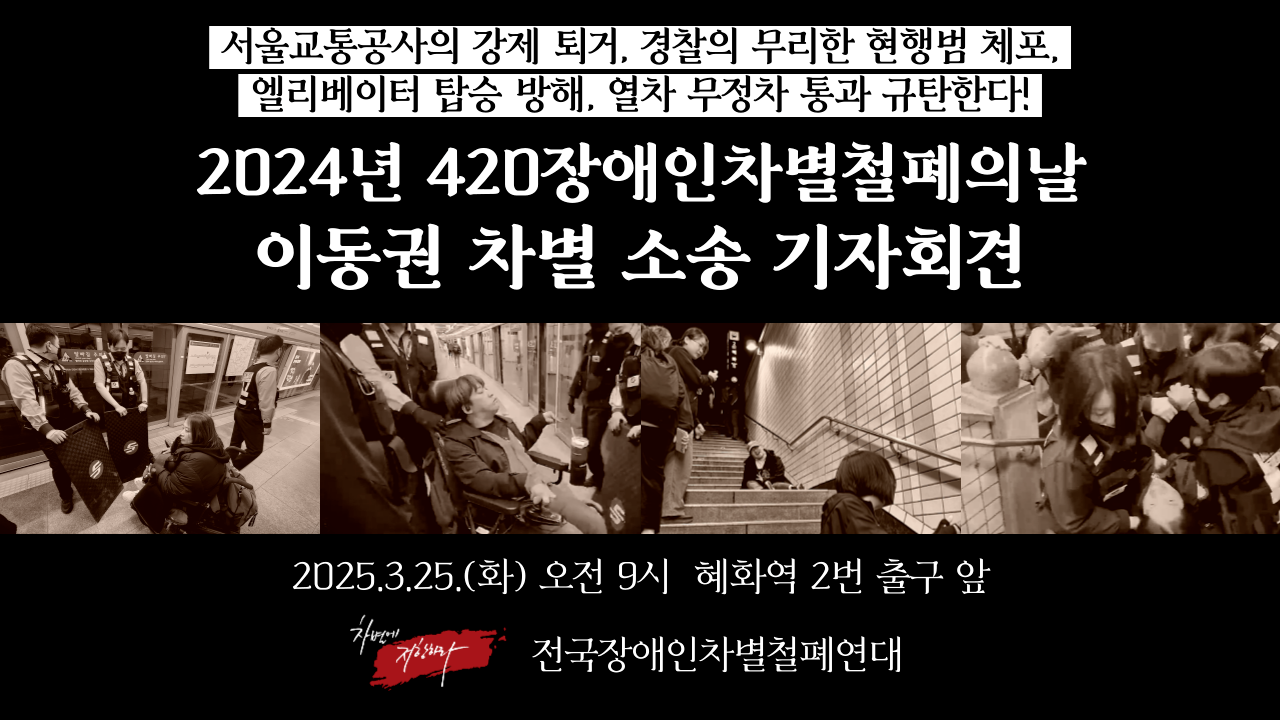 3. 매년 4월 20일, 국가가 정한 장애인의 날에 장애인은 거리로 나섭니다. 동정과 시혜로 얼룩진 정부의 기만적인 장애인의 날이 아니라 장애인 차별을 철폐하기 위해 나섭니다. 방안이나 시설에 박혀 보이지 않는 존재가 아니라, 지금 여기 살아 있는 시민임을 외치기 위해서입니다. 2024년 4월 19일, 장애인차별철폐의 날 결의대회 이후, 혜화역을 이용해 귀가하려던 휠체어 이용 장애인들은 서울교통공사와 경찰의 억압속에 지하철 탑승이 막혔습니다, 엘리베이터를 막고 열차를 무정차 통과 하는 등 장애인의 이동은 차단되었습니다. 이는 단지 시민의 이동권을 제한한 것이 아니라, 장애인의 존재 자체를 배제하고 거부한 행위였습니다. 단순한 충돌이 아닌, 공공기관이 주도한 명백한 국가폭력이자 헌법과 장애인차별금지법을 위반한 중대한 인권침해입니다. 오늘, 피해를 입은 세 명의 장애인은 대한민국과 서울교통공사를 상대로 손해배상청구 소송을 제기합니다.