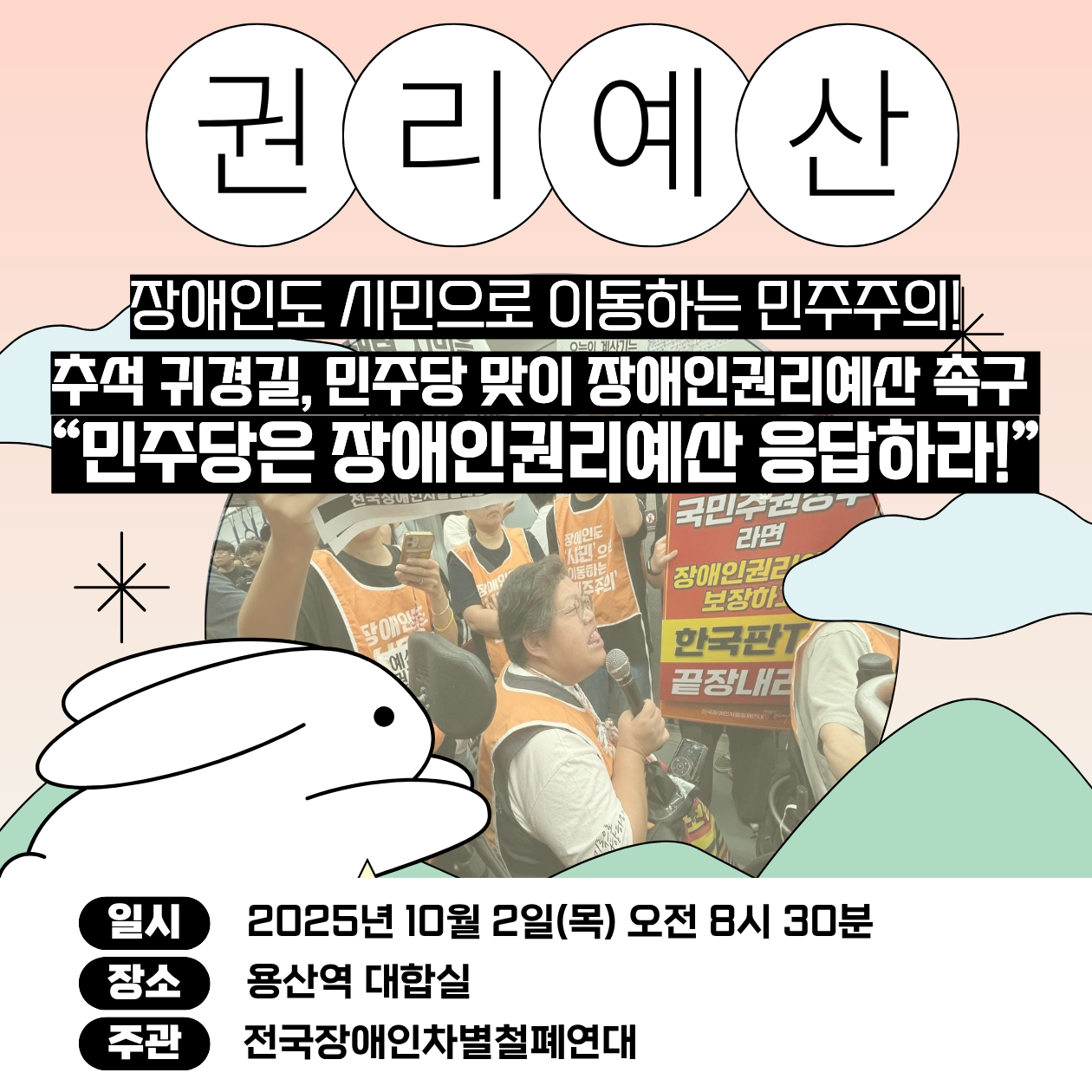8. 이에 전장연은 이번 추석 귀경길 맞이 장애인권리예산을 촉구하기 위해 2025년 10월 2일(목) 오전 8시 30분 용산역 대합실에서 당 대표들을 만나러 갑니다.