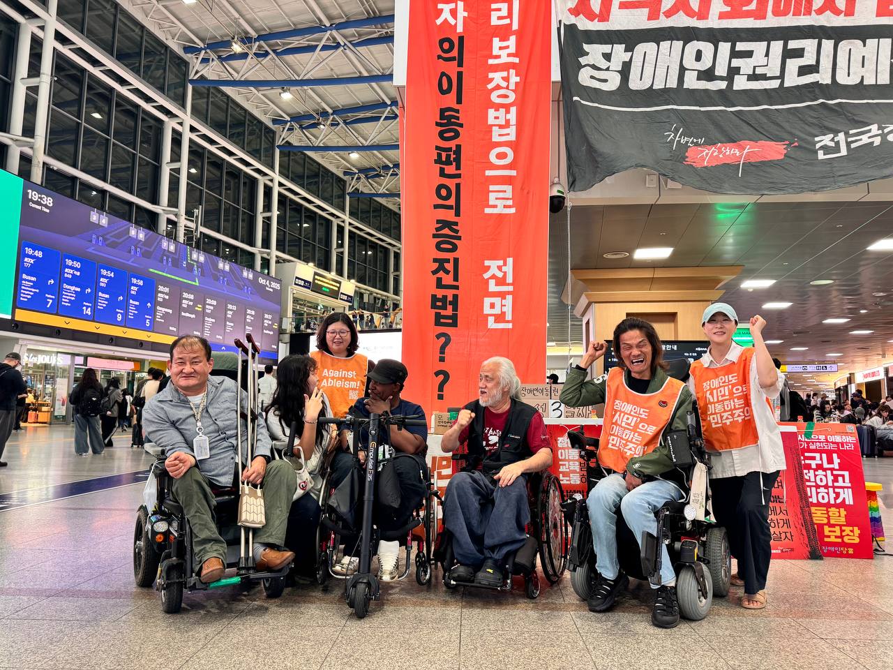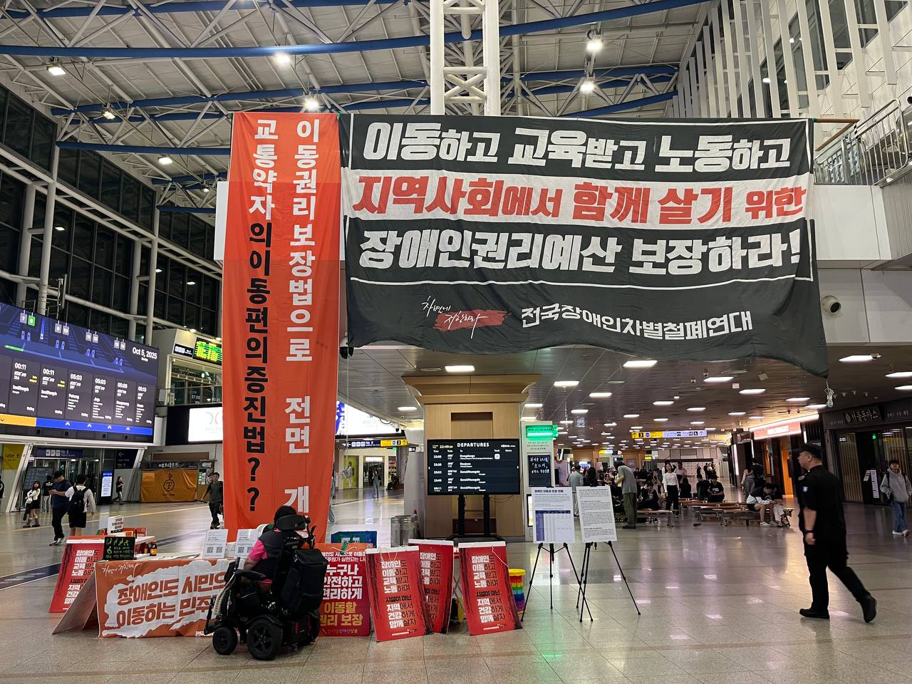 전장연은 10월 2일(목) 용산역에서 정청래 더불어민주당 당대표와 서왕진 조국혁신당 원내대표를 만나 장애인권리예산 요구안을 전달하고, 이후 서울역으로 이동하여 <장애인이동권대투쟁>을 선포, 천막농성에 돌입했다. 농성장은 서울역 대합실(2층)에 위치해있으며, 안내데스크 옆 교통약자이동권보장법 제정 촉구 대형현수막을 펼치고 22대 국회 1호법안(서미화 의원 대표발의)으로 발의된 <교통약자이동권보장법 제정을 위한 1만인 서명운동>을 진행하고 있다. (온라인 서명 : https://sadd.or.kr/access)