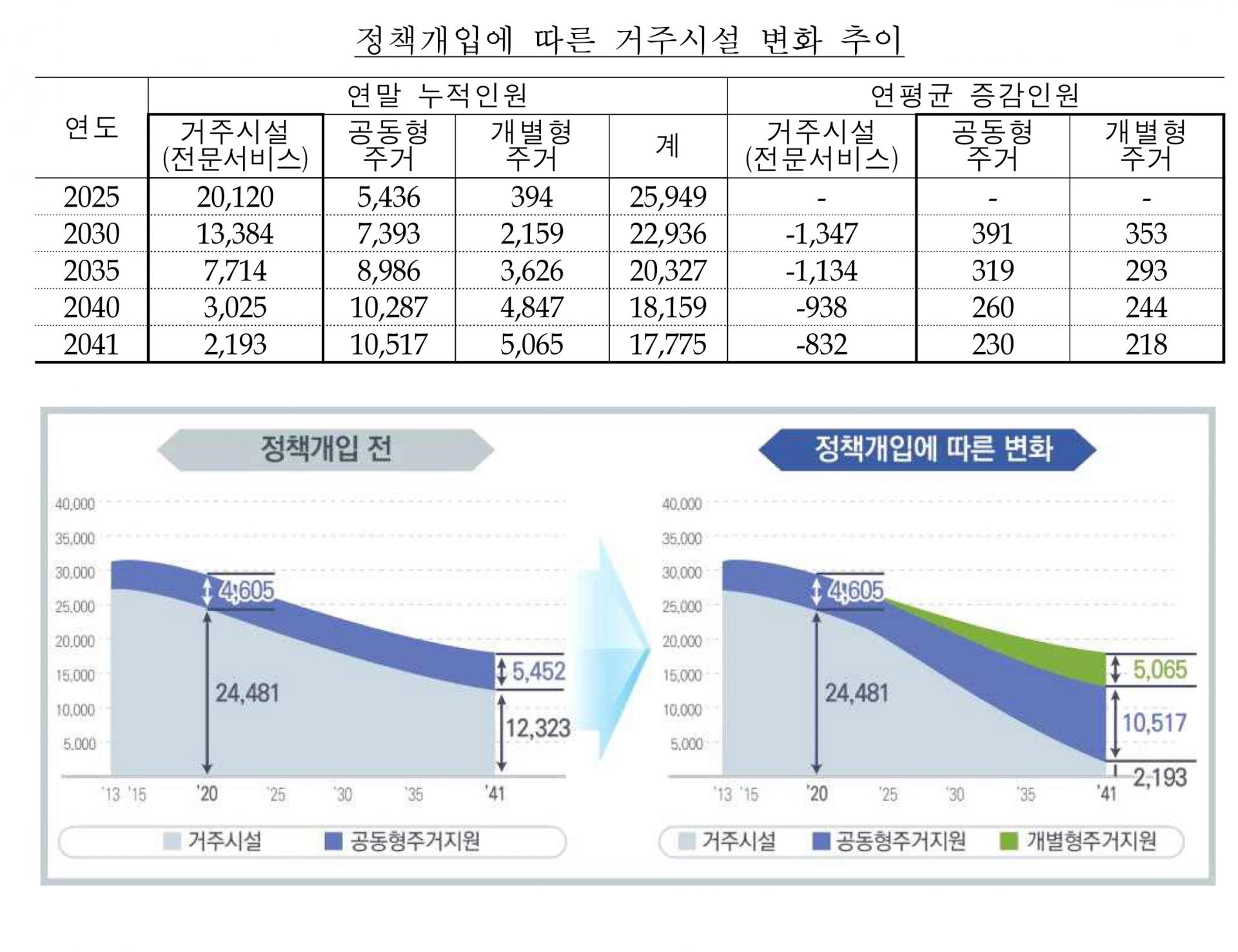 「장애인탈시설지원법」에는 집단적 수용방식의 대규모시설을 단계적으로 축소, 장애인에게 개별화된 지원계획을 수립하여 자립을 지원하도록 하고, 다만 인권침해 시설은 즉각 폐지하되 피해자들을 지원하도록 명시하고 있다. 또한 이러한 정부의 탈시설 추진계획은 2041년까지 계획을 세워 단계적으로 이행하도록 하고 있다. 이 내용은 이미 문재인 정부의 ‘탈시설 장애인 지역사회 자립지원 로드맵(2021.8.)’에 담겨 있던 내용으로, 로드맵에서는 2041년까지 대규모시설을 개인별주택과 공동형주거지원, 전문서비스로 장기적으로 변화시키겠다는 내용을 담고 있다.