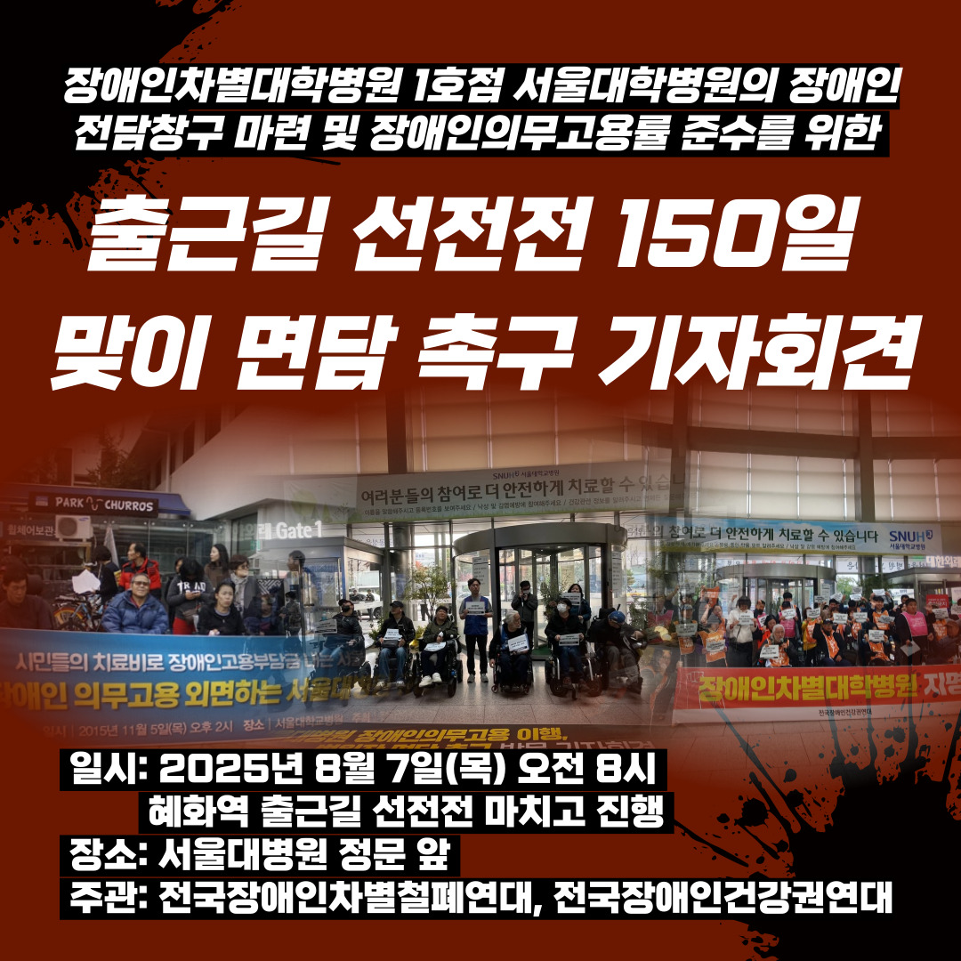 3. 전국장애인차별철폐연대는 전국장애인건강권연대와 함께, 2024년 10월 31일부터 지금까지 149일(8월 6일 기준) 동안 서울대병원 후문 앞에서 "장애인차별대학병원 1호점 서울대학병원의 장애인전담창구 마련 및 장애인의무고용률 준수를 위한 출근길 선전전"을 진행해오고 있습니다. 지난 7월 1일부터 7월 30일 한달 동안에는 국정기획위원회가 위치한 경복궁역에서 출근길 선전전을 진행하며, 장애인의료기관 이용 편의를 위한 장애인전용창구의 확대와 장애인고용촉진 제도 개편을 요구해왔습니다.