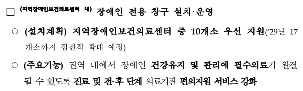 4. 장애인 전용 창구는 2025년 보건복지부 사업 예산안에서 처음 등장하여 지역장애인보건의료센터를 중심으로 우선 10개소, 이후 29년까지 17개소 확대하겠다는 계획이 발표되었습니다. 장애인 전용 창구는 수어통역사와 함께 장애인 전담코디네이터를 배치하는 사업입니다. 보건복지부가 지난 5월 13일(화)에서 6월 4일(수)까지 사업 수행기관을 공모하여 4개 시·도에서 13개 의료기관이 신청하였으나, 지역장애인보건의료센터 2개소를 포함하여 장애친화 건강보건관리사업을 시행하고 있는 의료기관 5개소가 선정되었습니다.