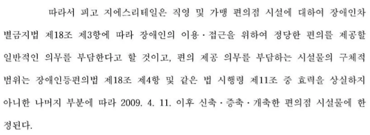 하지만 바닥면적 기준으로 편의시설을 설치하지 않는 것은 심각한 장애인 접근권 침해입니다. 2018년 휠체어를 이용하는 장애인이 GS리테일(GS25 운영사) 등을 상대로 제기한 차별침해 구제 소송에 대해 1심 재판부는 GS25 직영점에 편의시설 설치를 의무화하도록 판결했습니다. 이에 따라 GS25는 「장애인차별금지 및 권리구제 등에 관한 법률」(장애인차별금지법)이 시행된 2009년 4월 11일 이후 신·증·개축한 점포에 대해 편의시설 설치를 진행해 왔습니다.