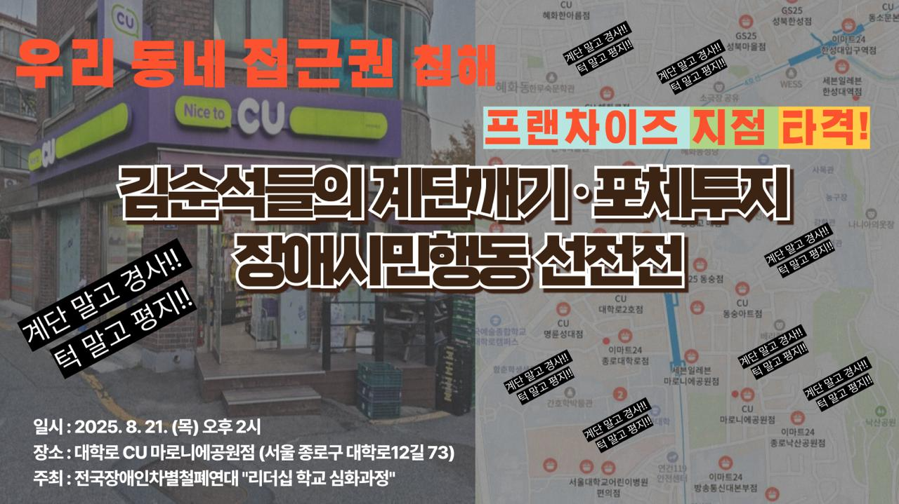 이에 우리는 8월 21일(목) 오후 2시, 3차 장애시민행동을 진행합니다. 계단을 오를 수 없어 실내에 접근할 수 없었던 장애인들이 CU 마로니에공원점에 마땅한 권리를 요구하고 경사로 설치를 촉구하기 위해 다시 한번 요구합니다. BGF리테일의 책임 있는 응답을 촉구하는 장애시민행동과 더불어 접근권 보장 요구안을 현장에서 전달할 예정입니다.