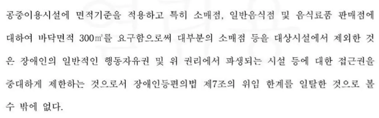 2022년 개정된 「장애인ㆍ노인ㆍ임산부 등의 편의증진 보장에 관한 법률」(장애인등편의법) 시행령에 따르면 바닥면적 50제곱미터 이상인 소규모소매점은 장애인편의시설 설치를 의무로 하고 있으나, 해당 시행령 시행 이전부터 운영한 점포에 대해서는 개정 이전의 기준인 바닥면적 300제곱미터 미만의 경우에는 편의시설 설치 의무에서 제외됩니다. 이에 따라 90%에 가까운 소규모소매점은 현재도 장애인편의시설 설치 의무에서 제외되는 실정입니다.