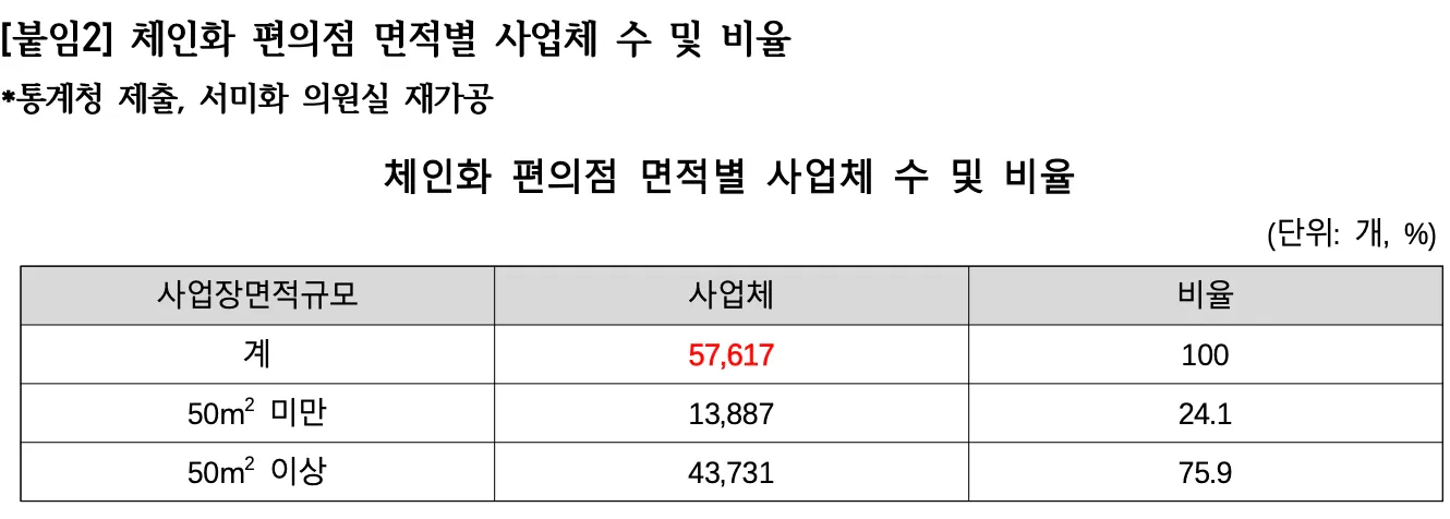 더불어민주당 서미화 의원실에 의하면, CU는 2022년부터 2024년 8월까지 50제곱미터 이상의 790개 매장에 경사로 492개, 내부벨 334개, 외부벨 416개가 설치되었으며, 신규 점포의 편의시설 설치율은 2022년 8.9%, 2023년 25.1%, 2024년 33.7%로 집계되었습니다. 2022년 기준 체인화 편의점 57,617곳 50제곱미터 미만 매장은 13,887곳(24.1%)이며, 나머지 43,731곳(75.9%)은 50제곱미터 이상입니다. 그러나 전체 편의점 5만 7천여 곳 중 편의시설 설치가 확인된 곳은 총 2,176곳에 불과합니다.