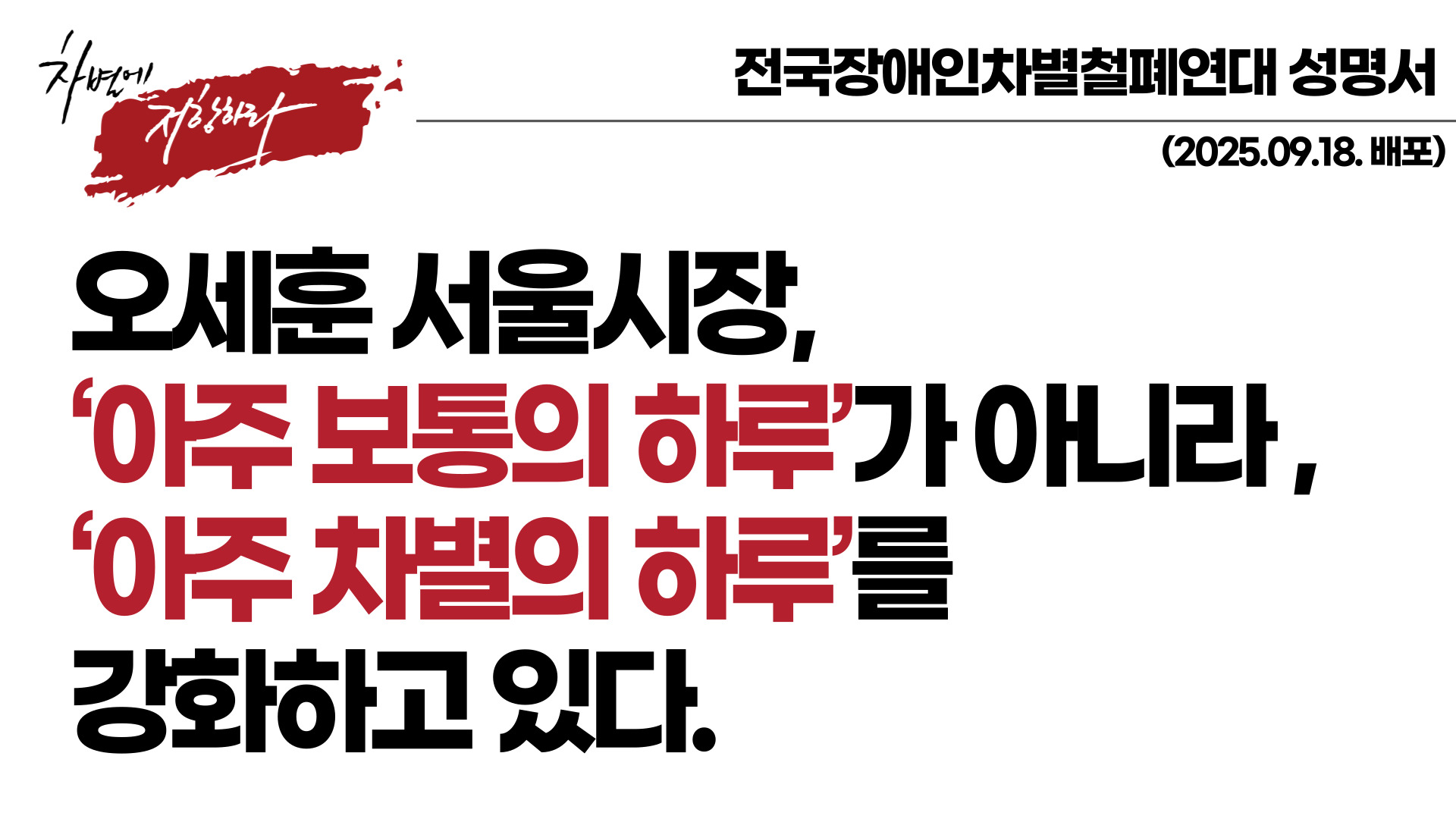 오세훈 서울시장은 공식석상에서 직접 설명하면서 사실을 왜곡하고, 거짓과 갈라치기를 통한 혐오 발언을 서슴치 않고 있다. 서울시장으로 최소한의 양심과 품격을 유지하기를 요청한다. 오세훈 서울시장의 장애인정책은 ‘아주 보통의 하루(아보하)’가 아니라 장애인의 격리와 배제를 강행하는 ‘아주 차별의 하루(아차하)’를 강화하는 정책이다.