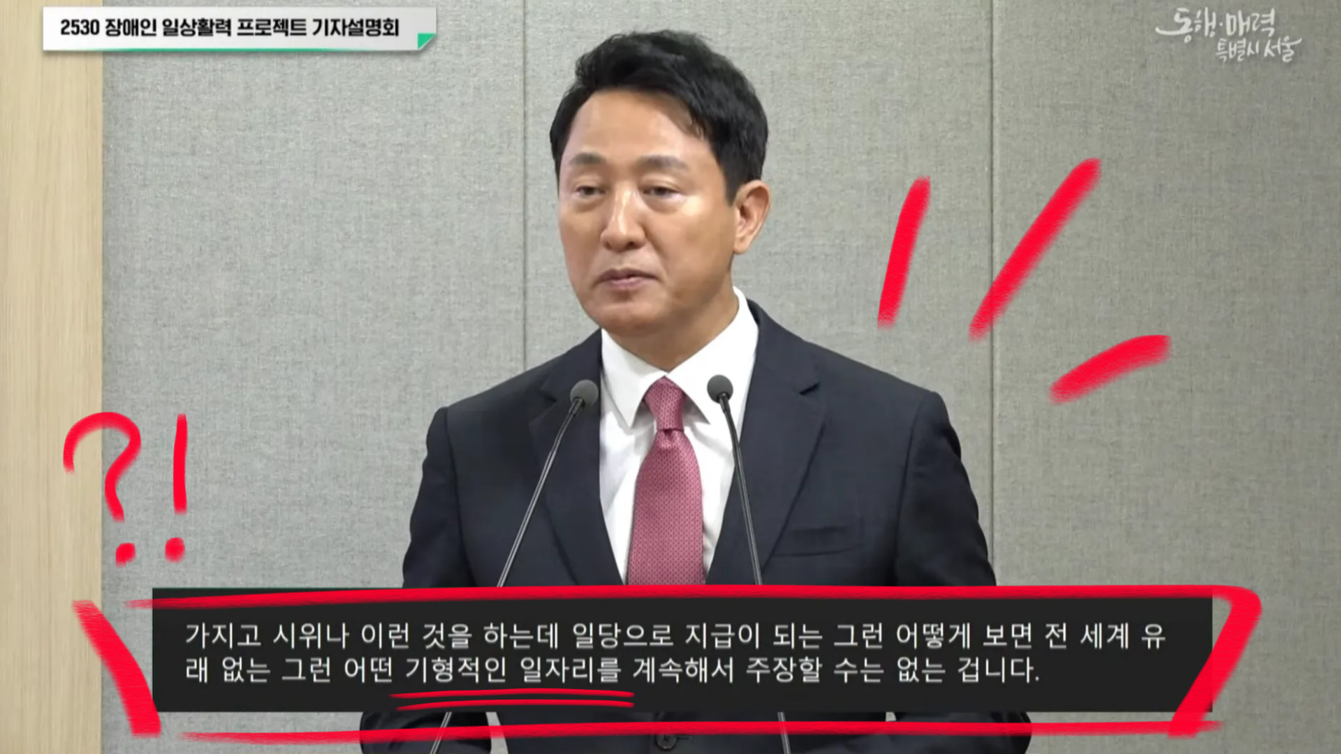지난 9월 16일, 오세훈 서울시장은 ‘2530 장애인 일상활력 프로젝트’라며, ‘아주 보통의 하루(아보하)‘를 발표했다. 오세훈 서울시장은 프로젝트를 설명하면서 기존의 노동능력 기준이 아닌 최중증장애인을 우선적으로 고용하는 ‘권리중심중증장애인맞춤형공공일자리’에 대하여 ‘기형적‘이라는 장애혐오 표현까지 사용하며 헌법적 권한인 ’집회와 시위 동원 일자리’라고 또다시 갈라치기와 낙인 발언을 반복하였다.