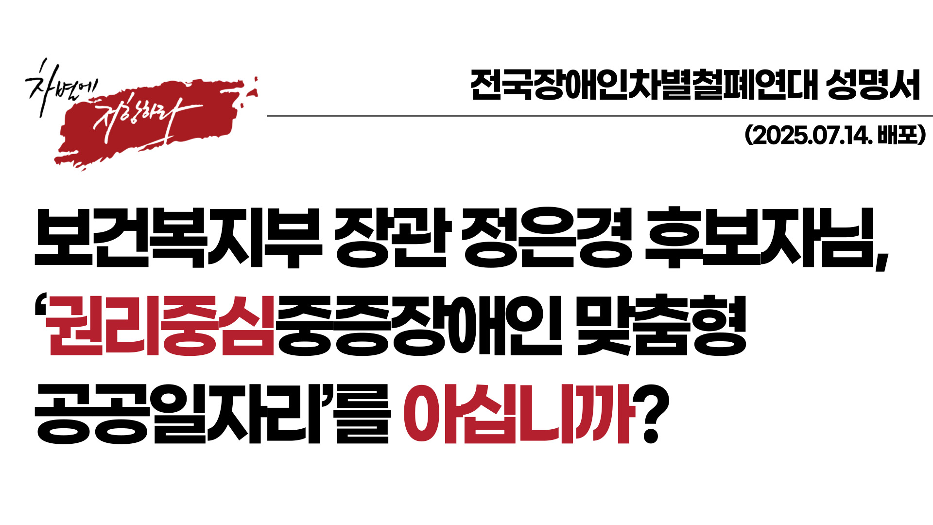 장애인직업고용재활촉진법 시행 이후 30년이 넘게 진행되어 온 경증장애인 중심의 고용 정책이 실패했음을 인정하시시오. 권리중심 중증장애인 공공일자리를 국정과제로 명확히 포함해주십시오. ‘사회적 합의’라는 이름으로 노동권을 유예하지 마십시오. 저희는 정은경 보건복지부 장관 후보자 집무실에서 농성으로 기다리고 있겠습니다.