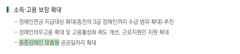 7. 한편 이재명 경기도지사 재임 당시인 2021년, 경기도는 지자체 중 서울에 이어 두 번째로 권리중심 중증장애인맞춤형 공공일자리 사업을 도입했습니다. 2022년 20대 대통령 선거에서 이재명 당시 후보는 ‘권리중심의 공공일자리’를 공약으로, 이어 21대 대통령 선거에서도 ‘중증장애인맞춤형 공공일자리’를 공약으로 내세웠습니다.