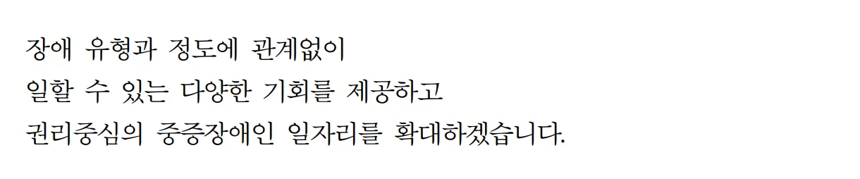 14. 이재명 대통령이 대선에서 약속한 ‘중증장애인맞춤형 공공일자리’와 ‘장애인자립생활센터 강화 및 확대’는 국민주권정부가 반드시 이행해야 할 국가의 책임입니다. 장애인자립생활센터의 기능 강화와 권리중심 공공일자리 도입은 이재명 대통령의 공식 공약이자 유엔장애인권리협약의 이행 수단입니다. 내란과 탄압으로 무너졌던 일상이 회복되고 있다고 하지만, 중증장애인에게는 여전히 ‘비상의 일상’이 계속되고 있습니다. 중증장애인이 지역사회에서 인간다운 삶을 살기 위해서는 권리중심 공공일자리 확대와 자립생활센터 강화가 필수적이며, 이는 선택이 아닌 정부의 의무임이 분명합니다.