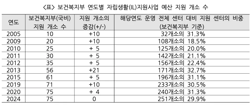 9. 한편 보건복지부는 장애인자립생활센터에 대한 지원 역시 보장하지 않고 있습니다. 장애인자립생활센터는 장애인의 자기결정권과 지역사회 자립을 실현하는 자조조직이자 권익옹호 단체입니다. 2003년 한자협의 출범과 함께 장애인자립생활운동이 한국사회에 자리 잡기 시작했고, 이에 정부는 2005년 ‘장애인자립생활센터 시범사업’을 시행했습니다. 그러나 이후 20년간 지원 센터 개소수는 소폭 상향에 그쳐 2025년 현재 전국 약 300개 센터 중 75개소 지원에 머물고 있으며, 예산 지원 액수 역시 20년 사이 예산 증액 폭이 총 9.4%에 불과(연 평균 0.6% 증액)합니다.