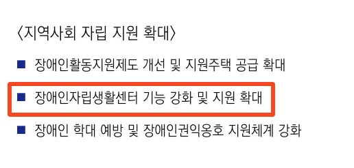 11. 그러나 장애인자립생활센터 기능 강화와 지원 확대는 국민주권정부 이재명 대통령의 공약에 분명히 명시되어 있습니다. ‘지역사회의 안전한 삶’을 훼손했던 내란의 시간은 비장애인에게는 잠시였으나, 중증장애인에겐 비정상의 일상으로 지속되어 왔습니다. 그 지역사회의 삶이라는 당연한 이념, 장애인의 시민권을 만들어 가는 공간이 장애인자립생활센터였기에 이재명 정부 또한 장애인자립생활센터의 기능 강화와 지원 확대를 약속했습니다. 그러나 국정기획위원회와 보건복지부는 장애인자립생활센터 강화 역시 회피하고 있습니다.