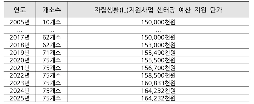 보건복지부 연도별 자립생활(IL)지원사업 센터당 예산 지원 단가