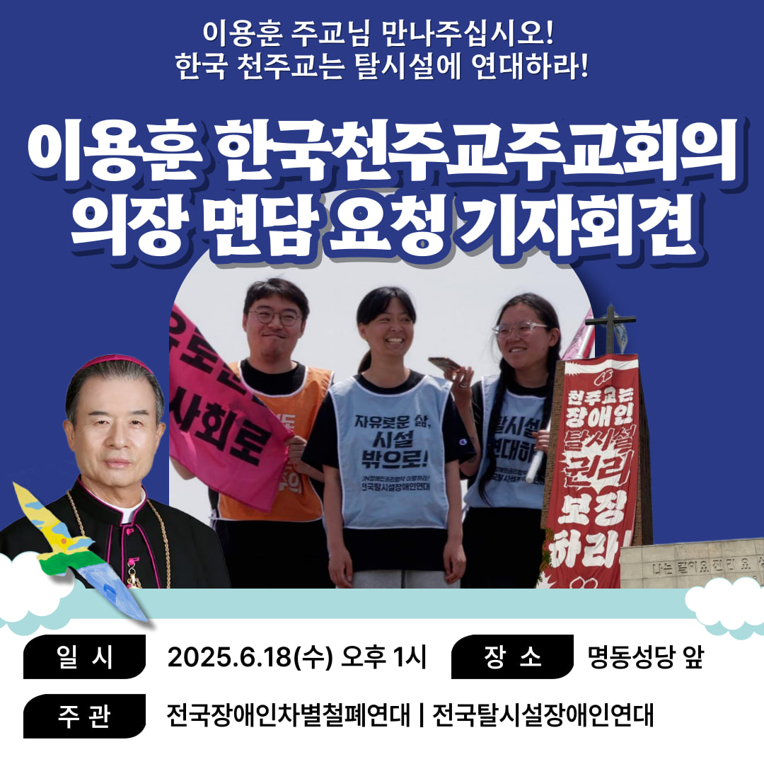 7. 저희 전국탈시설장애인연대와 전국장애인차별철폐연대는 이날 개막미사에 앞서, 한국천주교주교회의가 ‘시설 중심’의 시각에서 벗어나, ‘지역사회 중심’의 장애인권리 보장으로 나아가기를 함께 기도하며, 이용환 의장님께 면담을 요청드리고자 합니다. 이에 2025년 6월 18일(수) 오후 1시 명동성당 앞에서 이용훈 한국천주교주교회의 의장 면담 요청 기자회견을 개최하고자 합니다.